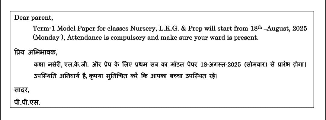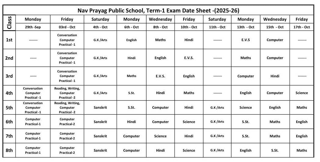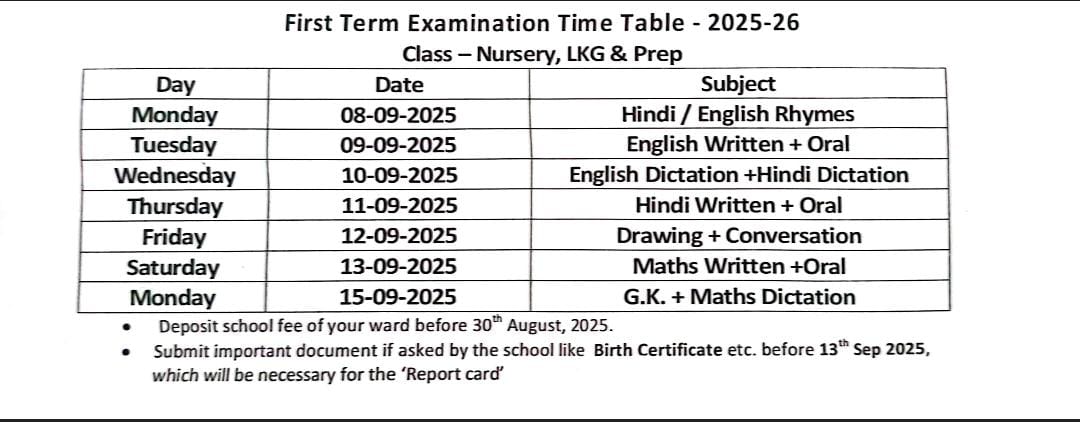 Ist Term Examination for Classes 1st to 8th will start from Monday (29-September-2025)